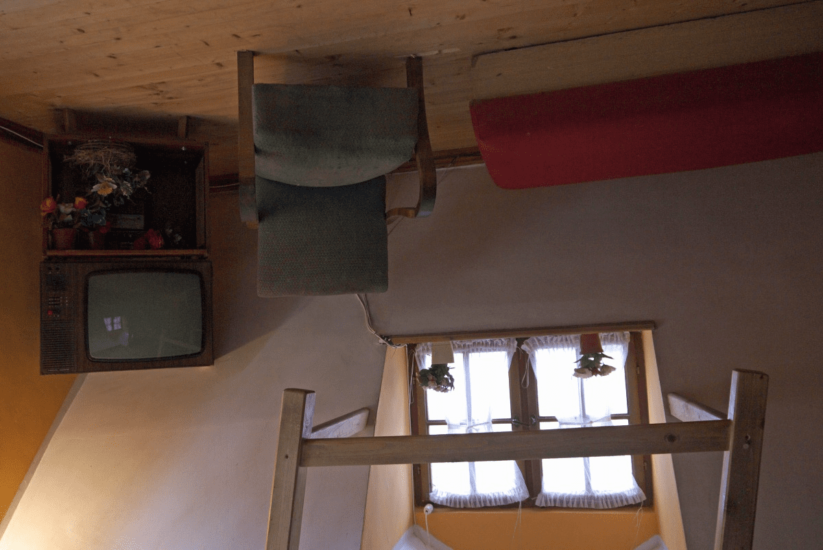 Aby dostać się do tego niezwykłego budynku, trzeba wejść przez okno. Po wejściu do środka odwiedzający często tracą równowagę, ponieważ mózg nie od razu przyzwyczaja się do tego nietypowego układu. Naprawdę dziwnie jest, gdy żyrandol znajduje się na podłodze, a krzesła, stół i inne rzeczy wiszą nad głową na suficie. Największe wrażenie robią prawdziwe, żywe kwiaty w doniczkach, które także rosną do góry nogami. Kiedy trochę się przyzwyczaisz, staje się ciekawiej i pojawia się chęć dokładnego zbadania wszystkiego. Wnętrze domu jest skromne, ponieważ zostało urządzone w stylu lat 70., czyli czasów Polskiej Rzeczypospolitej Ludowej. W duchu socjalizmu znajduje się tam pokój gościnny z telewizorem, kredens z prawdziwym kryształowym serwisem, jako symbolem tamtejszego dostatku, a nawet toaleta. W tamtych czasach minimalizm w aranżacji wnętrz nie był kaprysem właścicieli, ale surową rzeczywistością. Tę sytuację starali się odtworzyć twórcy projektu.