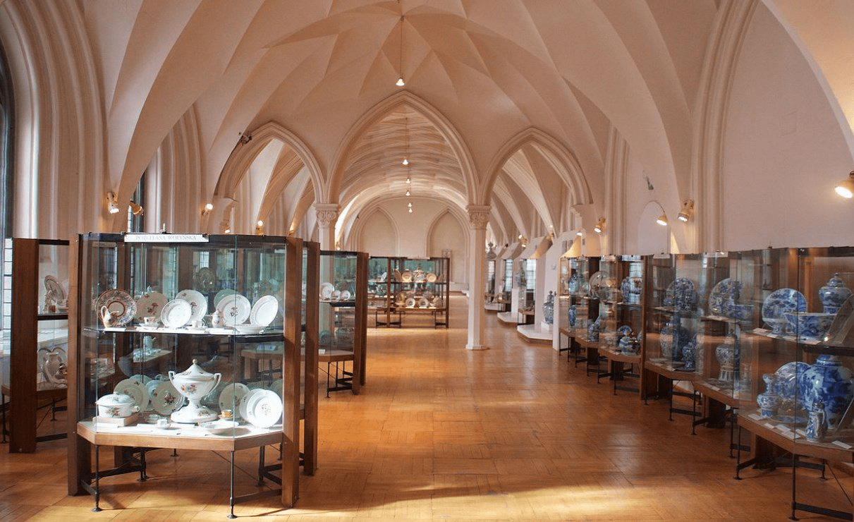 Galeria Cynowa to zbiór wyrobów z XV-XIX wieku. Na wystawie znajdują się również naczynia, dzbanki, talerze, filiżanki, kubki i łyżki. Galeria porcelany obejmuje fajans, ceramikę, majolikę, fajans pomorski, porcelanę dalekowschodnią i europejską.